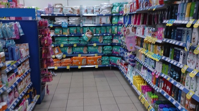 В магазине широкие проходы, для упрощения навигации используются указатели разных цветов для различных групп товаров. Из всех посещенных магазинов у «Космо» самая внятная навигация. На мой взгляд, можно было бы добавить общее освещение и сделать его более теплым.