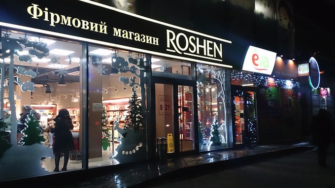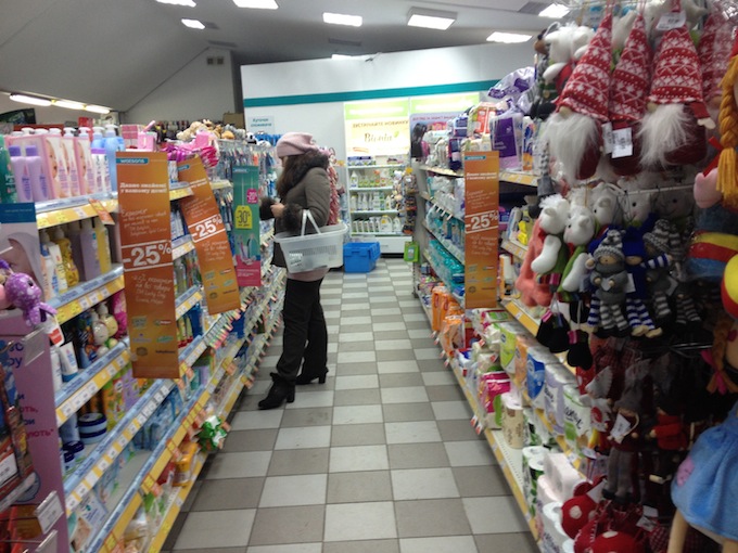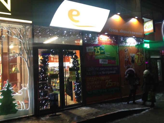 Первым на моем пути встречается магазин Eva — он появился относительно недавно и располагается рядом с магазином Roshen. Его витрина заклеена рекламными плакатами и в вечернее время почти не видна. Если смотреть на магазин с улицы, то в витрине заметен лишь платежный терминал в тамбуре. И хотя Roshen — не конкурент Eva, но на фото хороша видна разница: открытая прозрачная витрина выглядит намного привлекательнее. К тому же реклама, вывешенная в витринах, при маленькой ширине тротуара не читается. Многие ритейлеры, стремясь разместить как можно больше товара в зале, используют витрины как стены, для того чтобы поставить внутри дополнительные секции пристенного торгового обрудования. На мой взгляд, такая стратегия не всегда работает, и во многих случаях открытая витрина привлечет больше покупателей.
