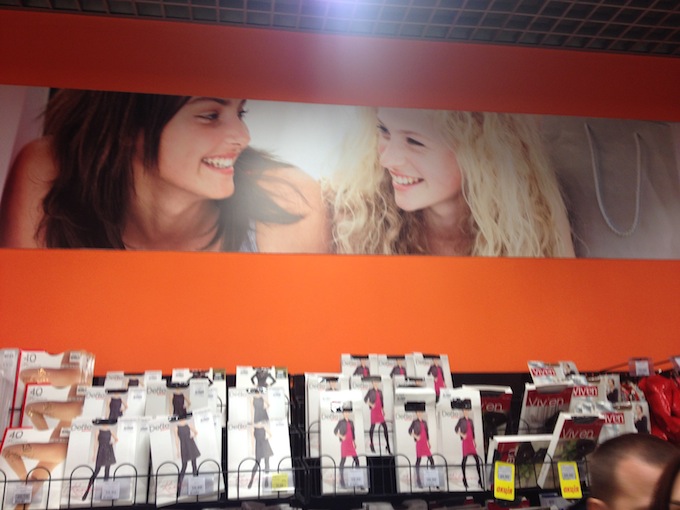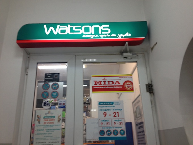 Следующей на моем пути оказывается точка Watsons. У этого магазина хуже локация, он находится на втором этаже, что дает меньше возможностей для коммуникации с потребителем с помощью витрины. Магазин имеет общий вход с мясным павильоном, что, конечно же, сказывается на его доступности. Чтобы попасть в магазин, нужно пройти несколько мелких точек, торгующих пуговицами и бижутерией. Входная дверь наглухо заклеена рекламой.