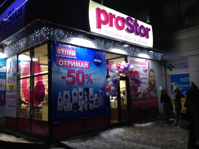 Витрину возле входа Prostor использует для рекламных постеров, которые очень небрежно наклеены. На фото ниже хорошо видно, как уютно и привлекательно выглядит прозрачное окно магазина (сбоку от входа) по сравнению с пузырчатыми плакатами. Но для привлекательности входа используют шарики. Я бы просто оставил открытые витрины, тем более магазин внутри очень яркий и теплый.