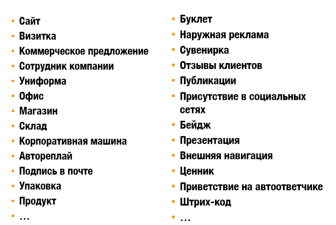 Точки контакта могут быть следующие: 1) печатные материалы компании (буклеты, брошюры, листовки); 2) визитные карточки сотрудников; 3) фирменный бланк; 4) фирменный договор; 5) вывеска при входе в офис; 6) голос вашего секретаря и его манера общения с клиентами; 7) музыка (приветствие), которую слышит клиент, ожидая соединение; 8) сайт компании; 9) шаблон ваших корпоративных презентаций; 10) ваши переговорные комнаты; 11) внешний вид и манеры ваших сотрудников; 12) слоган компании; 13) ваши подарки и сувениры; 14) ваш прайс-лист.