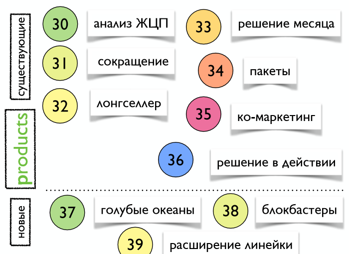 Есть специальные упражнения, которые помогут эффективно использовать комплекс маркетинга. Одним из них является анализ жизненного цикла продукта — ЖЦП — на стадии роста, на стадии насыщения или спада. Чтобы увеличить продажи, эффективнее будет сократить ассортимент, хотя обычно вывод напрашивается иной. У компании Apple было 350 продуктов. Стив Джобс сократил до 18. Можно продавать пакетами, если так для вашего продукта будет эффективнее, или взаимодействовать с другими компаниями и продавать услуги пакетом: к примеру, чтобы извиниться перед девушкой, можно продать цветы плюс поход в ресторан. Лонгселлер — это продукт, который долго продается. У нового продукта «голубой океан» конкурентов пока нет.
