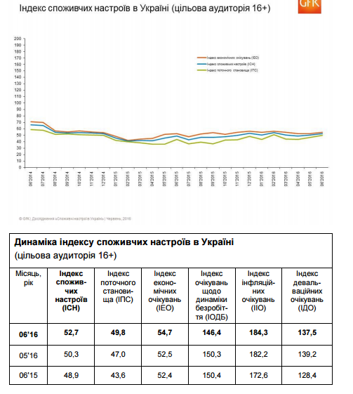 В июне 2016 года потребительские настроения украинцев улучшились: индекс потребительских настроений (ИПН) составил 52,7, что на 2,4 п. больше майского показателя. Наибольшие изменения получил индекс текущего личного материального положения. Об этом свидетельствуют данные исследования потребительских настроений в Украине, которое ежемесячно осуществляет GfK Ukraine
