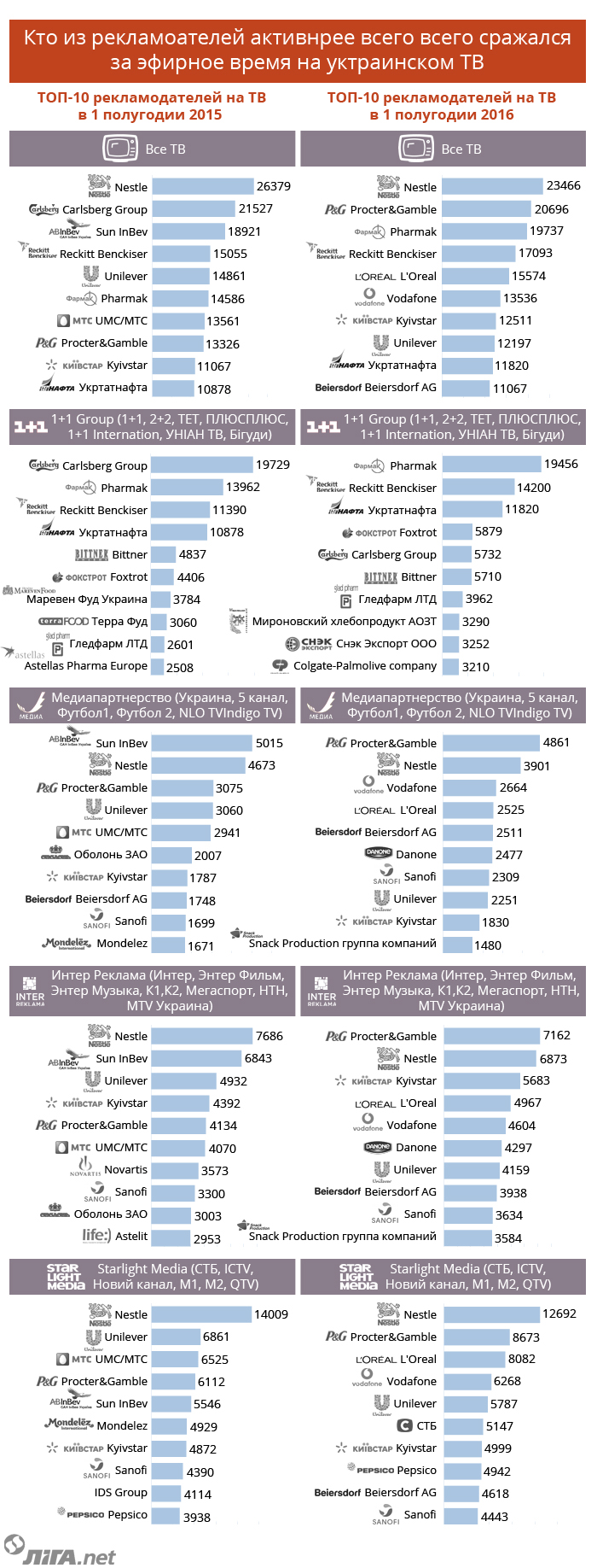 После запрета на рекламу пива перечень топовых рекламодателей на ТВ переформатировался. Результаты января-июня 2016 года в инфографике ЛІГА.net