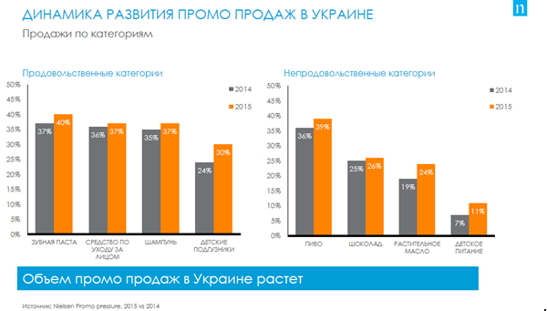 При анализе общих продаж в розничных сетях Украины выяснилось, что процент продаж, которые проходят через промоакции, для непродовольственных товаров достиг 38%, что на 6 п. п. больше, чем в І квартале 2015 года.