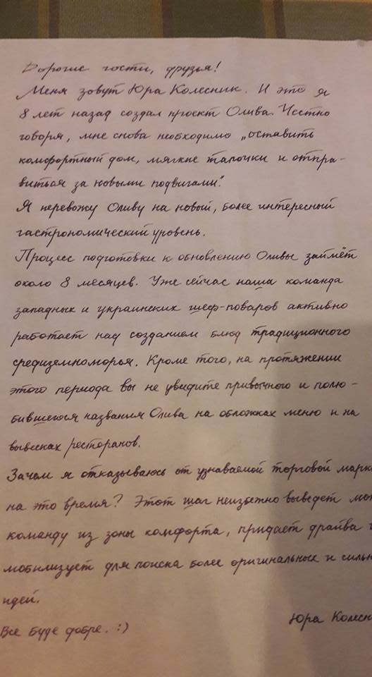 Управляющая сетью Oliva Юлия Николаева от комментариев отказалась, отметив, что на все вопросы сможет ответить на следующей неделе. В заявлении от имени владельца Юрия Колесника, которое можно было найти на столиках заведения, говорится, что процесс трансформации займет около восьми месяцев.
