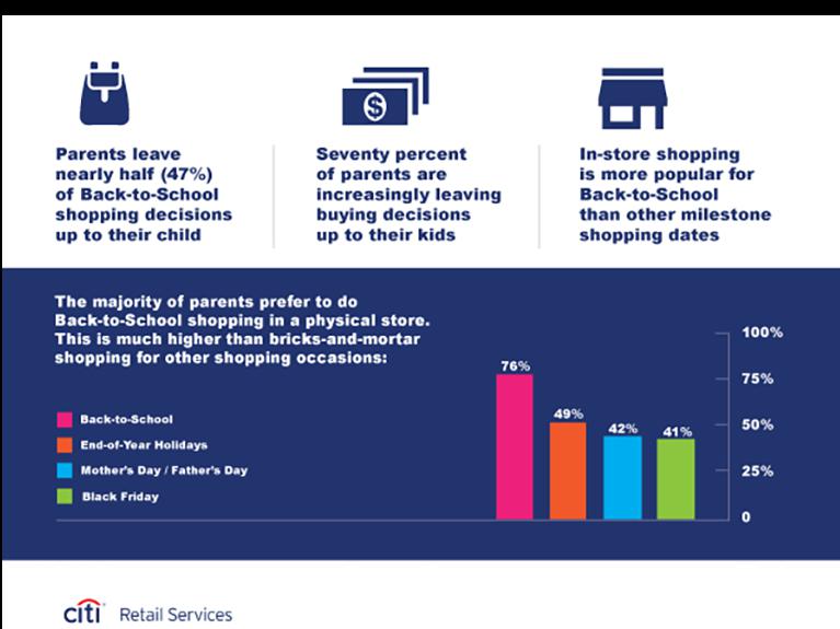 Когда речь идет о шопинге накануне учебного сезона, дети имеют власть над родителями. Недавнее исследование, проведенное Citi Retail Services, показало, что дети обладают необычайной силой над принятием решений о покупке, и эти решения включают покупки товаров и услуг в физических магазинах