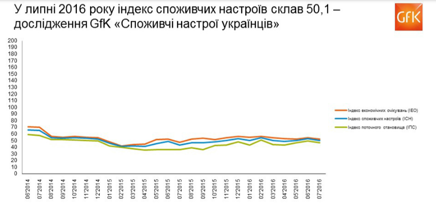 «В июле наибольшее падение получил индекс целесообразности делать крупные покупки, что отражает чувства неуверенности среди потребителей относительно перспектив будущего экономического развития. Индекс инфляционных ожиданий вырос после периода спада в мае-июне 2016 г. и вернулся на уровень первого квартала», ─ комментируют аналитики GfK Ukraine.