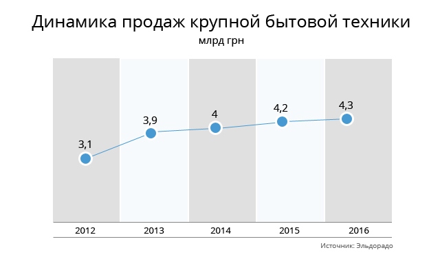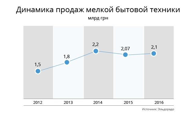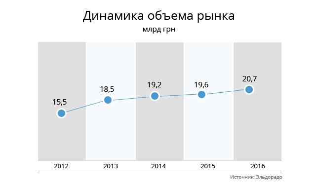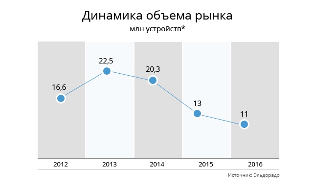 Смартфоны — единственный сегмент, который показывает динамичный рост. По данным «Эльдорадо», если в первой половине прошлого года продано устройств на сумму 4,2 млрд грн, то в январе-июне этого — на 6 млрд грн. По данным исследовательской компании GfK Ukraine, во втором квартале 2016 года продано около 1,1 млн смартфонов и мобильных телефонов, что на 43% выше показателя второго квартала 2015 года.