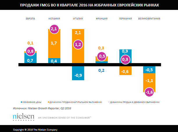 Во втором квартале 2016 года цены на товары повседневного спроса (FMCG) выросли всего на 0,7% по сравнению с аналогичным периодом предыдущего года, в то время как объемы продаж выросли на 0,1% — самый низкий показатель в течение более двух лет. Таким образом, продовольственные ритейлеры зафиксировали рост выручки в кассе на уровне 0,8%, что является самым низким показателем с момента начала измерений в четвертом квартале 2008 года.
