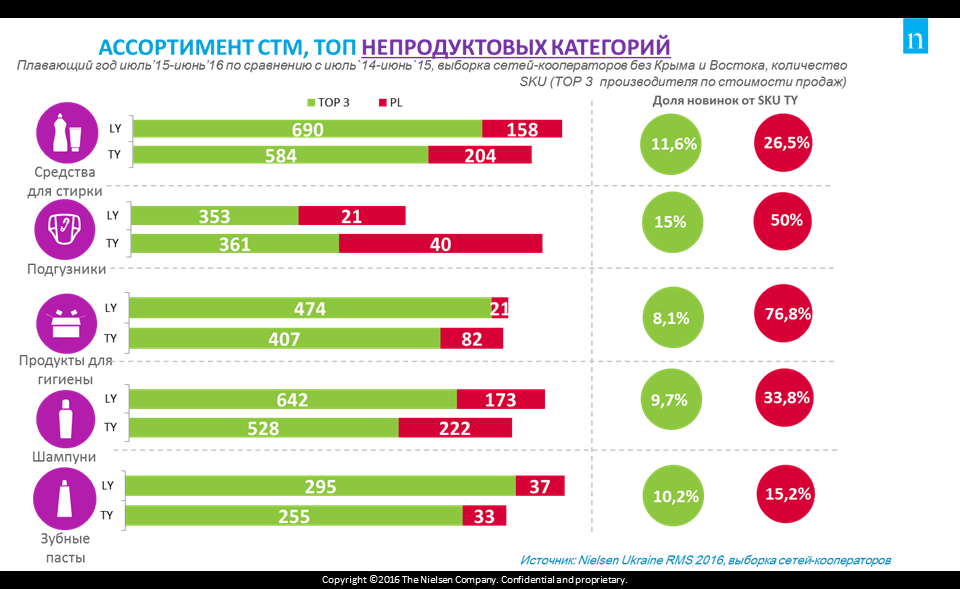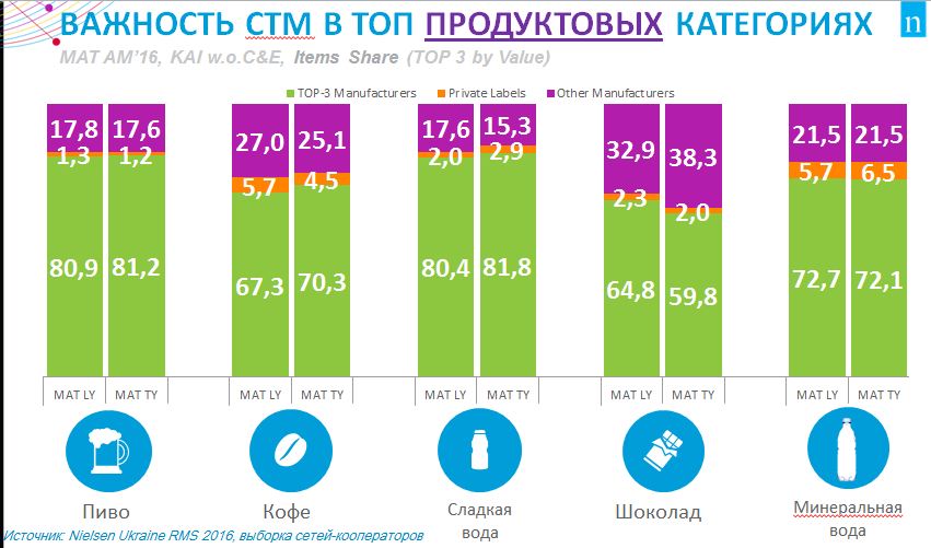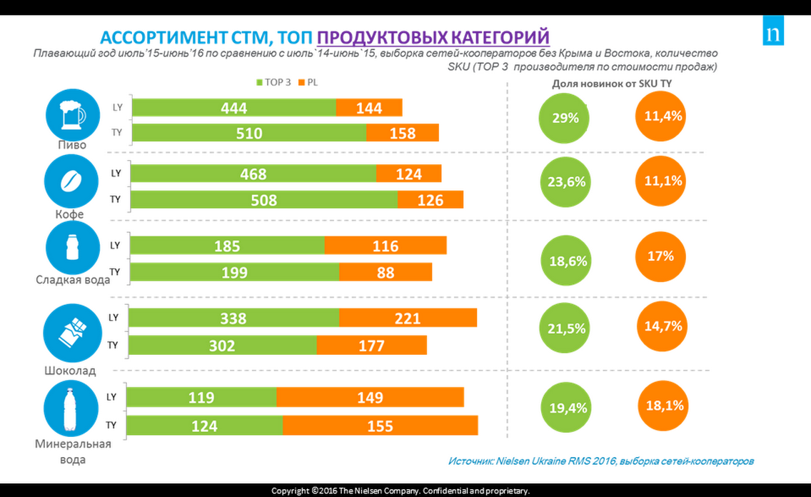На Международном форуме по private label и экспорту VLASNA MARKA & EXPORT: 2016 директор стратегического развития в Украине и Беларуси компании Nielsen Виталий Брык рассказал о последних результатах исследования динамики развития СТМ розничных fmcg-сетей-кооператоров Nielsenв Украине. В топовых по объему продаж продуктовых категориях доля СТМ практически не менялась. Она незначительно увеличилась по товарам, цена которых выросла, вследствие чего покупатели начали искать альтернативу топовым производителям. В непродуктовых категориях СТМ , наоборот, нарастили долю за счет уменьшения объемов производства ведущими производителями. Количество активных SKU в продуктовых категориях по большей части растет, в том числе за счет ротации, а в непродуктовых категориях — по большей части за счет появления новых позиций.