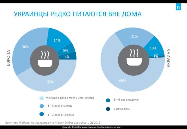 Из последнего глобального исследования Nielsen Dining-out trends о потребительских привычках в отношении питания вне дома следует, что как украинцы, так и европейцы в целом редко питаются вне дома