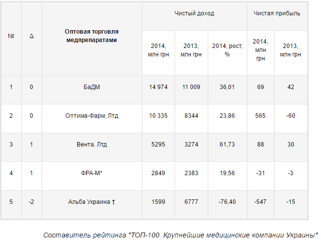 Четыре дистрибьютора («БаДМ», «Оптима-Фарм», «Вента» и «Альба»), которые оштрафованы АМКУ, являются крупнейшими на рынке Украины и до 2014 года контролировали 90% всех отгрузок лекарственных средств (в денежном выражении). Об этом пишет «Топ-100. Крупнейшие медицинские компании Украины».
