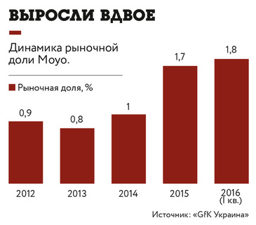Выйдя на рынок электроники в 2009-м, за 2,5 года компания Moyo открыла 37 магазинов. К 2012-му ее оборот достиг $50 млн. Если в сегменте ТЕМАХ (бытовая техника и электроника), который «GfK Украина» оценивала в 2012 году в 44,4 млрд гривен, доля Moyo составила 0,9%, то в первом квартале 2016-го компания увеличила долю до 1,8%. Об этом пишет Forbes