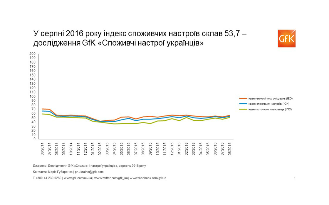 «В августе 2016-го вырос индекс ожидаемого развития экономики на ближайший год, а также улучшились ожидания относительно динамики безработицы. Индекс ожидаемого развития экономики (x3) достиг 50, что является самым высоким значением за период с августа 2014 года, когда произошло падение этого индекса. Этот результат свидетельствует о надеждах граждан на восстановление экономики», ─ комментируют аналитики GfK Ukraine.