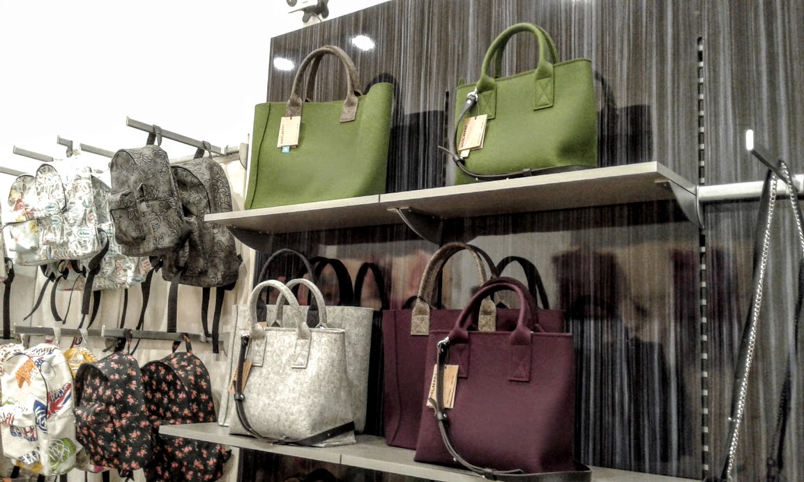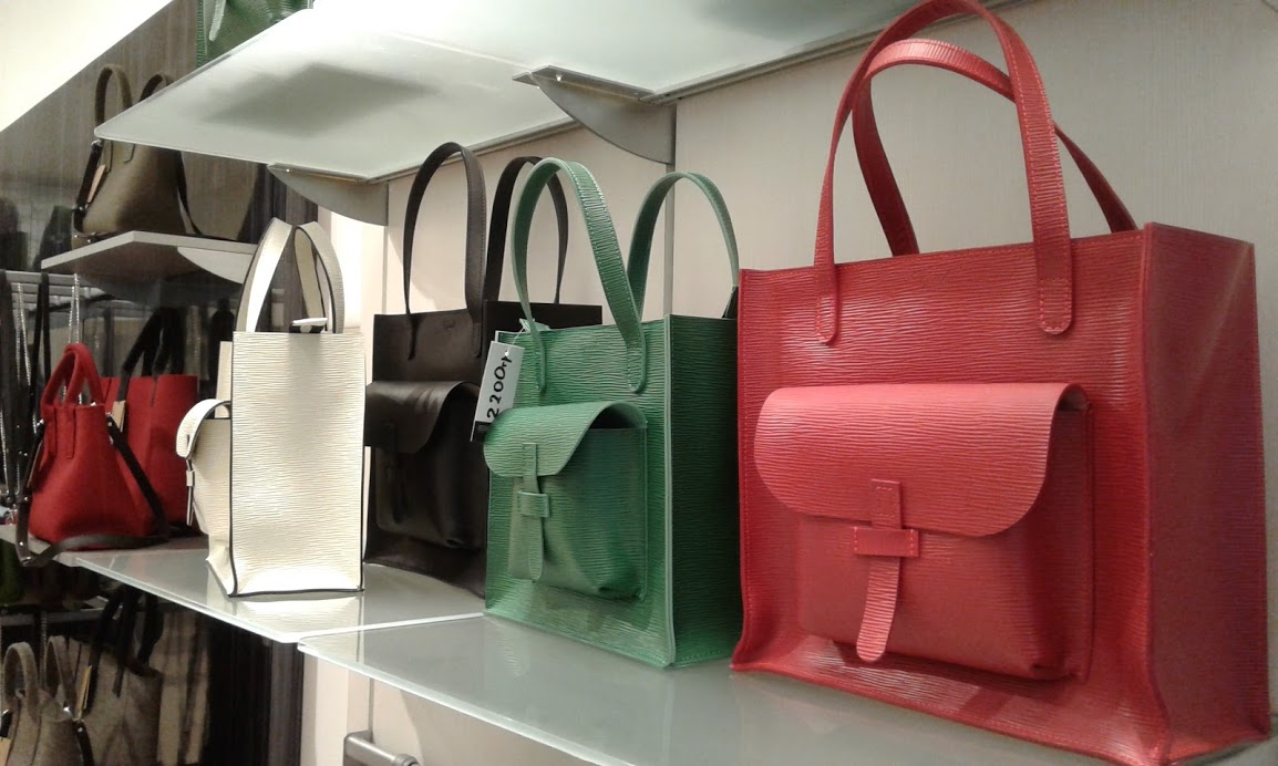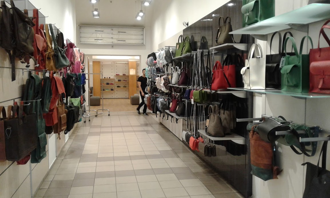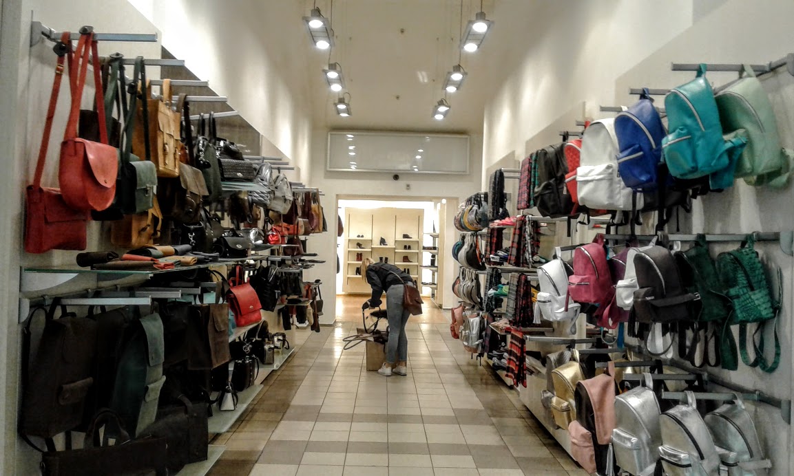 С двух сторон лестницы размещаются торговые галереи с сумками, кошельками, рюкзаками и другими аксессуарами.
