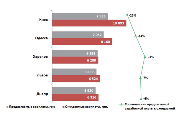Наименьшим разрывом между вакансиями и резюме отличился Харьков — всего 1%. Наибольшая разница, естественно, в столице — киевские соискатели хотят на 25% больше, чем предлагают киевские работодатели. Достаточно серьезный разрыв наблюдается в Одессе — 14% против 6–7% в Днепре и Львове. Что интересно, в абсолютных цифрах заработные платы Харькова, Львова и Днепра находятся практически в одной «весовой категории», а вот запросы у соискателей разные.