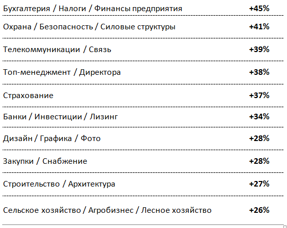 Лидерами по неудовлетворенности являются бухгалтеры — они заинтересованы в зарплате наполовину большей, чем предлагают работодатели. Ненамного отстали охранники, связисты и директора. Тем не менее существуют сферы, в которых работодатели более благосклонны к соискателям.