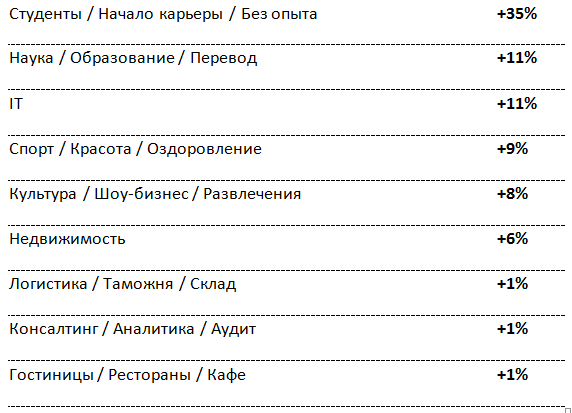 Все же не стоит радоваться тому, что студентов привлекают высокими зарплатами: в этот раздел попали и вакансии для опытных специалистов, на которые (но на совсем другую зарплату) работодатели готовы рассмотреть и студентов. Более реальны +11% для IТ-специалистов и специалистов сферы образования, хотя и там перевес достигается за счет нереализованного желания работодателей привлечь опытных профи, а не студентов, которых, впрочем, тоже готовы рассмотреть.