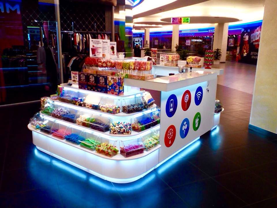 На специальном торговом оборудовании с креативным дизайном в помещении площадью 7 кв. м представлены леденцы, конфеты, шоколадки и напитки из Чехии, Польши, Испании, Голландии.