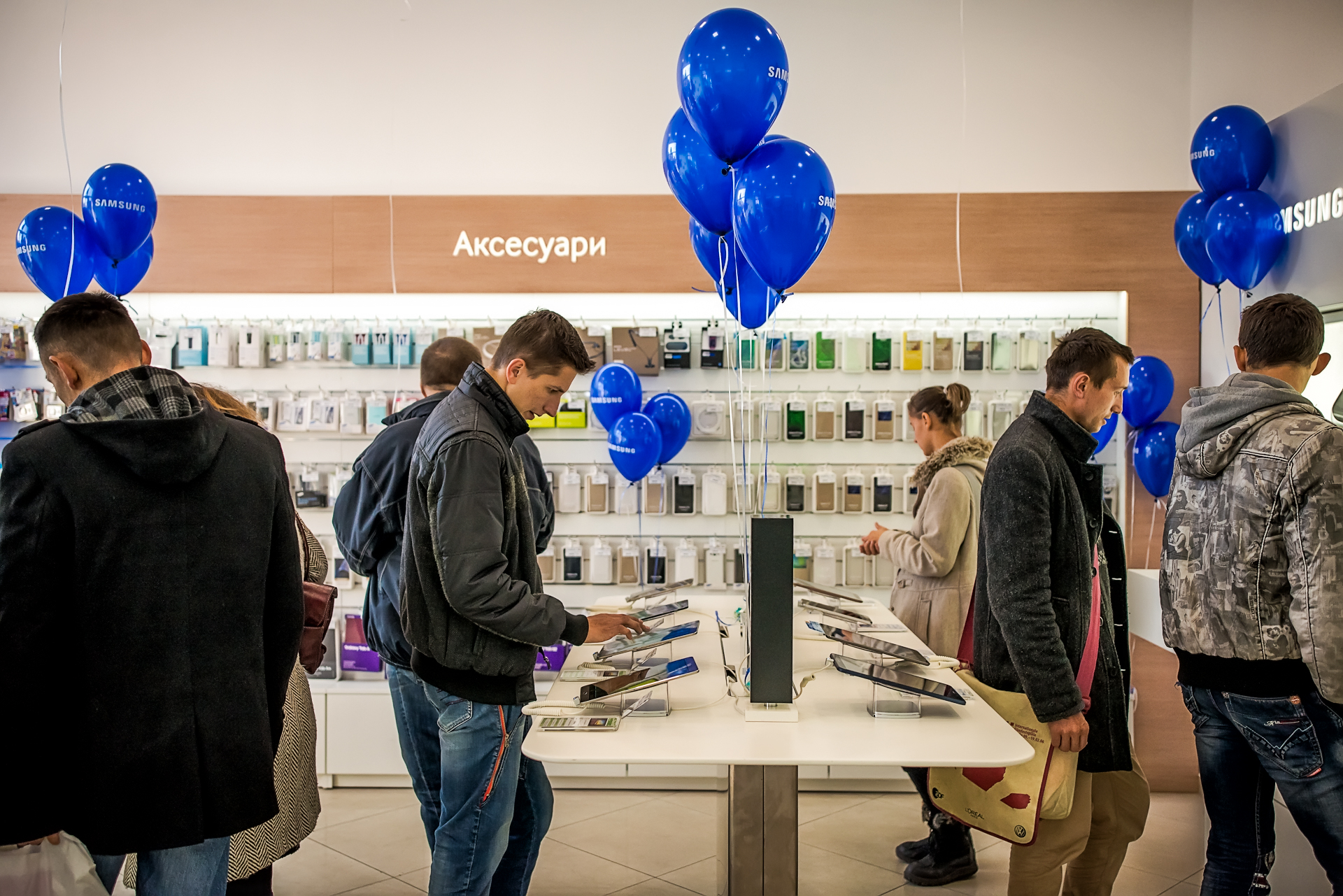 В монобрендовом магазине Samsung площадью 80 кв. м представлена вся продуктовая линейка смартфонов, планшетов, серия ТВ и аксессуары. Торговый зал оформлен в формате «открытая выкладка», благодаря чему клиенты лично могут ознакомиться с новейшими достижениями в разработках новых функциональных возможностей от компании Samsung.