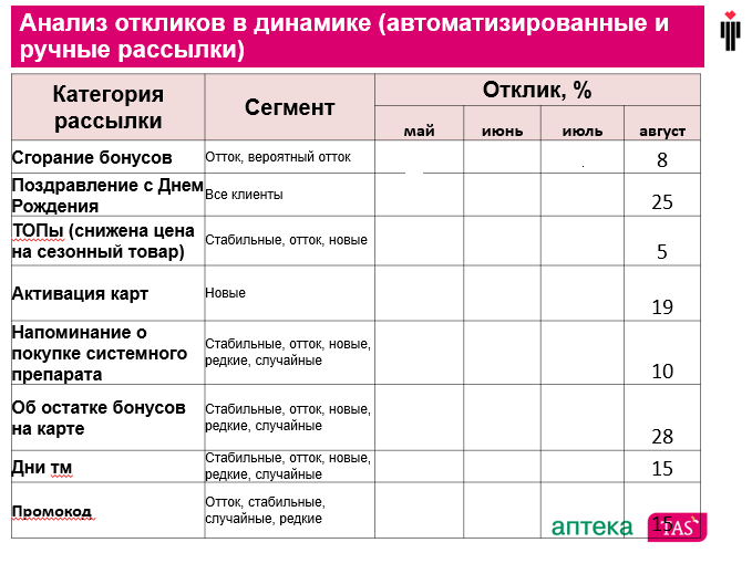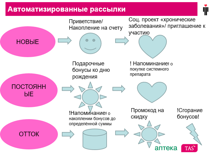 Ноухау TAS - напоминание о покупке системного препарата: было выбрано около 100 наименований, по которым проанализировали продолжительность курса лечения и высылали повторное напоминание приобрести для эффективного лечения. Все рассылки аналиируются.