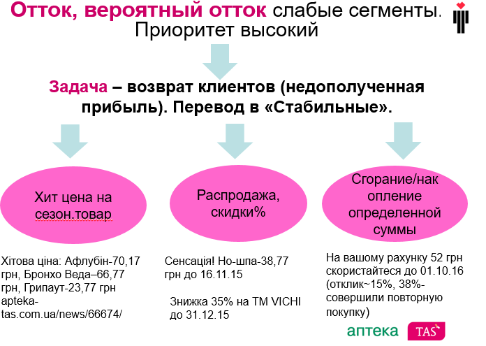 Задачей при работе с сегментом «отток» был возврат клиентов, получение недополученной прибыли и перевод их в сегмент «стабильные». Клиентам этого сегмента предлагались специальные цены на сезонный товар, распродажи и скидки, им отсылались уведомления о сгорании/накоплении определенной суммы бонусов на карте.