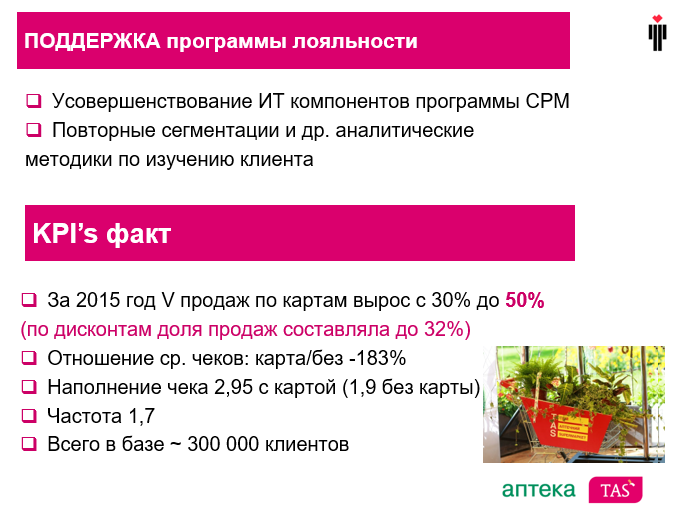 На XII Международном форуме «Лояльный покупатель: где у него кнопка?» директор по маркетингу сети аптек ТАS (Киев) Юлия Литвиненко в ходе выступления рассказала, как компания внедряла программу лояльности в сети аптек, с какими проблемами столкнулась, как происходила сегментация клиентов и с помощью каких интструментов с ними работали. В компании достигнутыми показателями довольны: по итогам 2015 года доля продаж по картам увеличилась с 30 до 50% в общем объеме продаж, а наполнение чека с картой — до 2,95 вместо 1,9