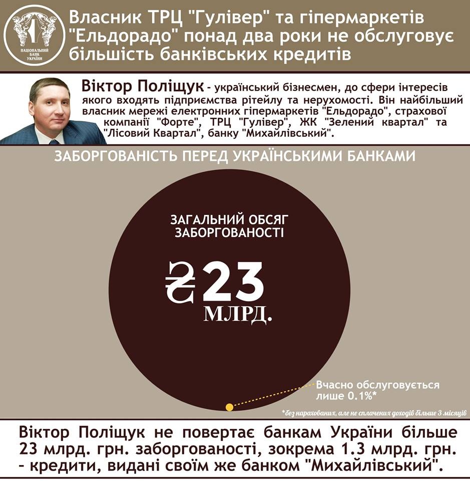 Владелец банка Михайловский, бизнесмен Виктор Полищук, не возвращает банкам Украины более 23 млрд гривен кредитов, среди которых 1,3 млрд кредита в своем банке Михайловский. Об этом пишет НВ Бизнес со ссылкой на соответствующее сообщение Нацбанка