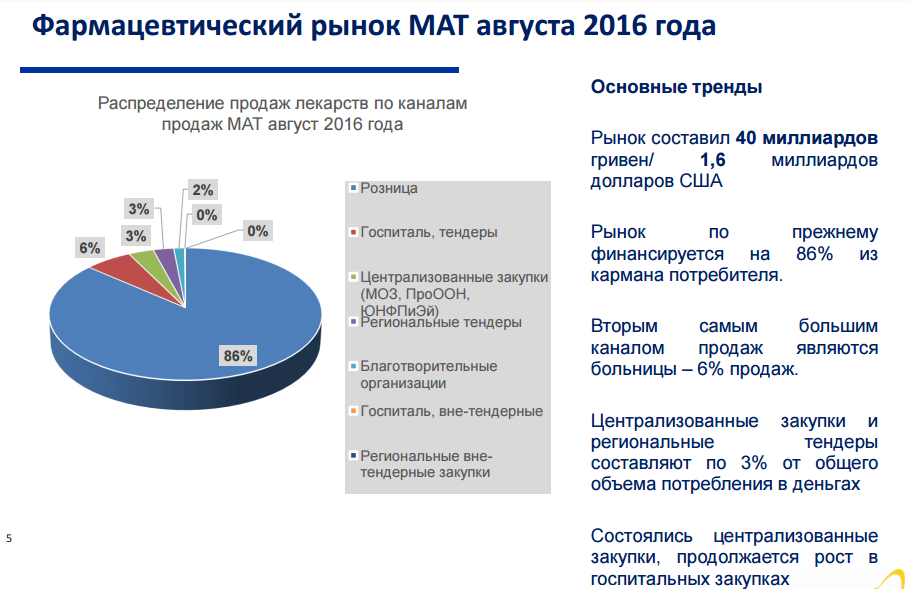 SMD представила анализ фармацевтического рынка по итогам 8 месяцев 2016 года. Общий объем рынка составил 40 млрд грн. Розничная торговля медпрепаратами занимает 86% рынка. Рынок начал расти, но пока не превысил объемы прошлого года.