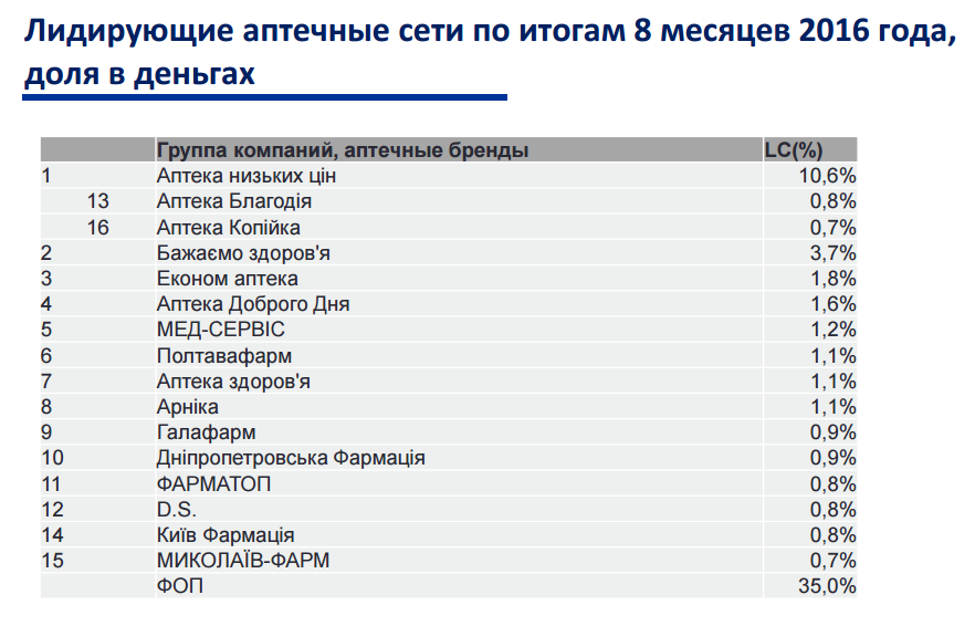 Консолидация аптечного рынка, по словам Ирины Горловой, происходит, но небыстро. В рейтинге по выручке лидирует «Аптека низких цен» со своими другими двумя брендами — «Благодія» и «Копійка». Суммарно доля этой компании занимает около 12–13% рынка. На втором месте сеть «Бажаємо здоров'я», на третьем — «Эконом аптека». Отличительной особенностью аптечного рынка является большое количество аптек, зарегистрированных как ФОП. Их доля постоянно растет и составляет 35%.