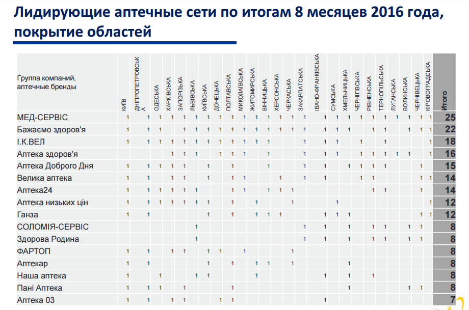 Динамика развития у каждой сети разная. В SMD построили рейтинг по коэффициенту покрытия аптеками областей Украины. Для расчета была взята представленность сети не по количеству точек, а по наличию бренда в областях Украины. Аптеки «Мед-сервис» работают во всех областях страны. Второе место, как и в рейтинге по доле в деньгах, занимает «Бажаємо здоров'я». «Этот рейтинг показывает, что не так много сетей имеют общенациональный характер. Всего 10–15 сетей представлены в большинстве регионов Украины», — отмечает Горлова.