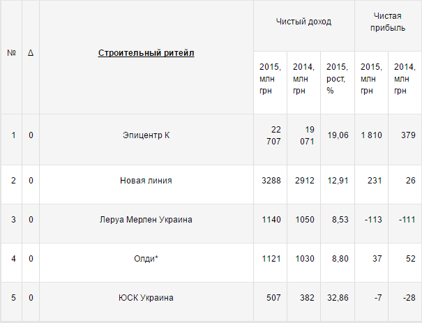 На первом месте ожидаемо сеть «Эпицентр» (ООО «Эпицентр К»). По данным журнала «Топ-100. Рейтинги крупнейших», чистый доход «Эпицентра» за 2015 год составил 22,7 млрд грн против 19 млрд в 2014 году. Чистая прибыль компании за 2015 год — 1,8 млрд грн.