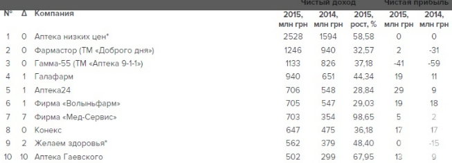 Лидером среди аптечных сетей по выручке является аптека «Магнолия», занимающая около 7,4% рынка. Компания развивает на украинском рынке сети «Аптека низьких цін», «Копейка» и «Благодія», общее количество торговых точек которых составляет 441. В прошлом году сеть активно расширяла присутствие в регионах, открыв 58 аптек, благодаря чему нарастила свою рыночную долю с 5,5% по итогам 2014 года. К тому же компания осваивала совершенно новый формат — автоматизированные аптеки под ТМ «Копейка».