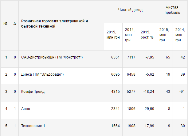 Самым доходным ритейлером по итогам прошлого года стала сеть «Фокстрот» (компания «САВ-дистрибьюшн»), с чистым доходом в 6,5 млрд грн. На втором месте — «Эльдорадо» (компания «Диеса»), оборот которой порядка 6 млрд грн.