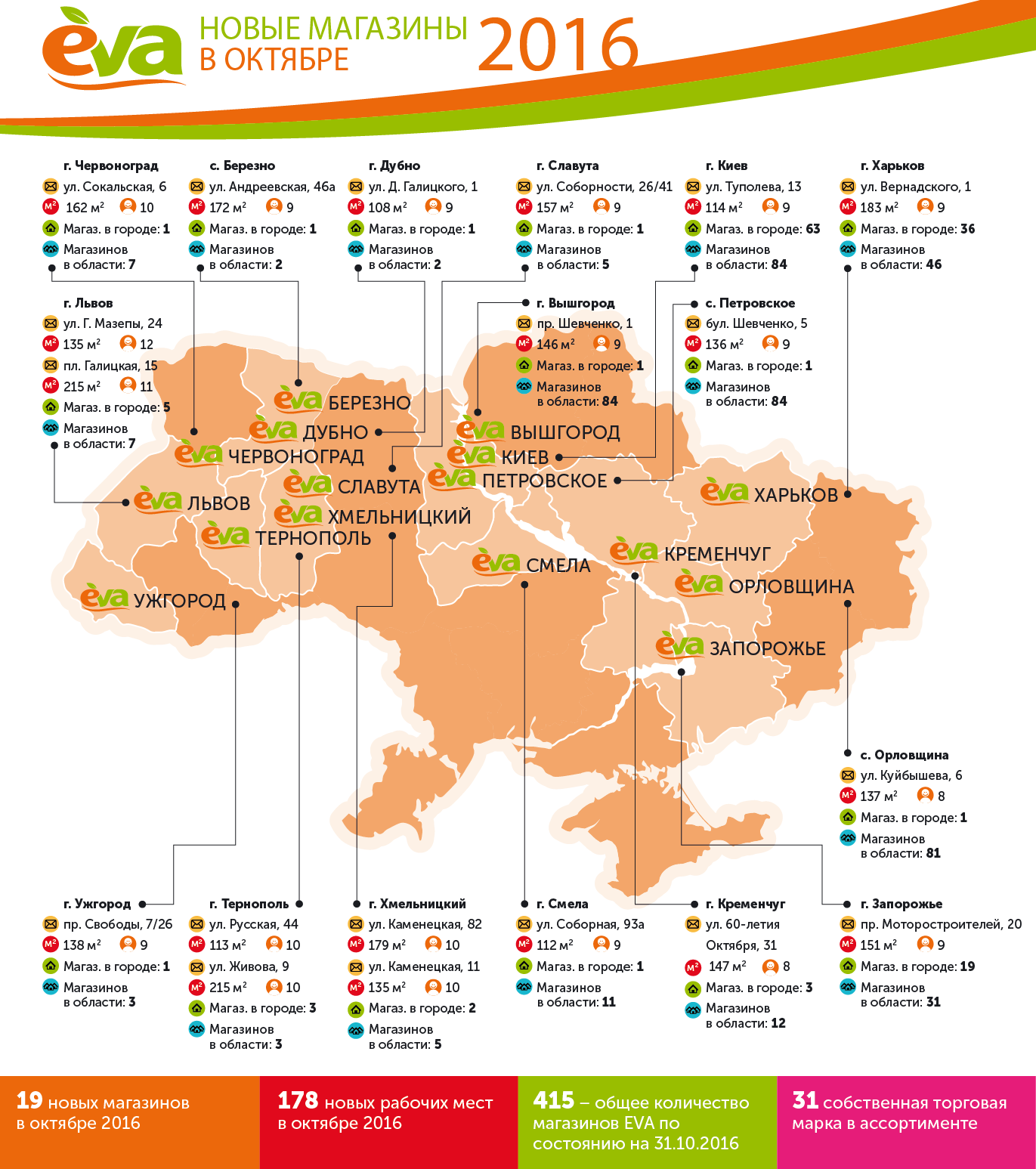 В Ужгороде открылся первый магазин EVA. Торговая площадь составляет 138 кв. м. Всего в Закарпатской области насчитывается 3 торговые точки EVA. В с. Жидачев также открылся первый магазин, его торговая площадь составляет 138 кв. м. Во Львовской области это уже 7-й магазин. В с. Петровское это 1-й магазин EVA, в Киевской области — 84-й. Торговая площадь точки составляет 136 кв. м.