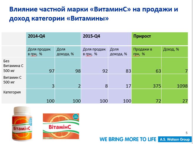 Как работают в аптеках Watsons с собственными торговыми марками, Константин Дегтярев показал на примере частной марки «ВитаминС». По итогам IV квартала 2015 года, ее доля в продажах в категории «Витамины» составила 8%, в доходе — 17%. Благодаря «ВитаминС» доход всей категории вырос на 27% по отношению к аналогичному периоду 2014 года. Если бы в компании не ввели новую марку, то рост дохода был бы 7%.