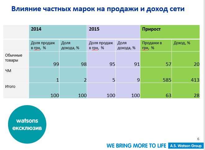 Частные марки занимают всего 5% товарооборота аптечной сети. По итогам 2016 года продажи аптек Watsons выросли на 63%, а доход на 28% вместо 20. Увеличение дохода на 20% аптеки получили бы за счет продажи обычных товаров. Положительная разница в 8% возникла благодаря развитию частных марок и, по мнению Дегтярева, это является очень хорошим результатом.