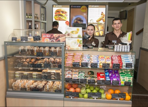 Кафе имеет полный ассортимент блюд, в том числе кофе-поинт, оборудованный двумя интерактивными кофейными аппаратами Franke для самостоятельного приготовления кофейных и других напитков.