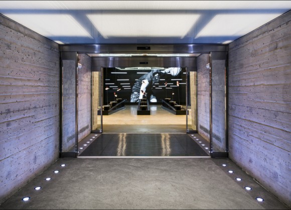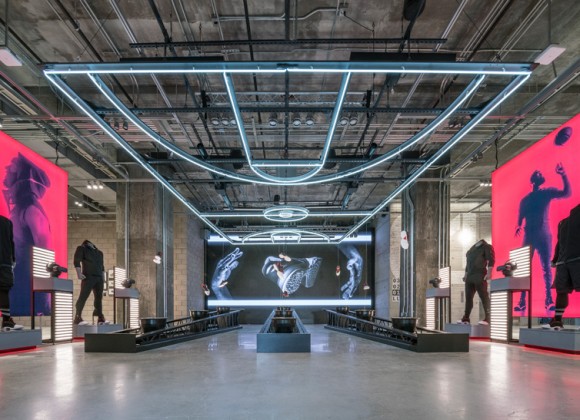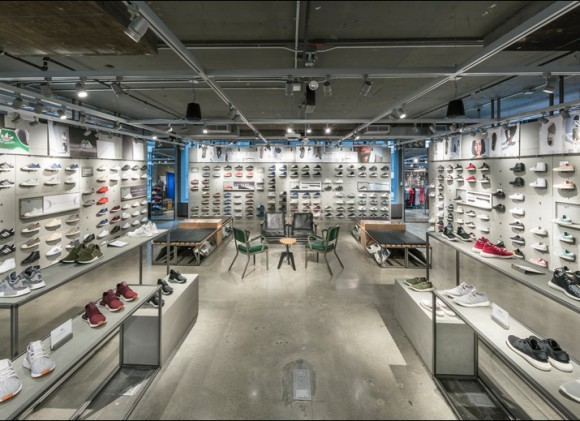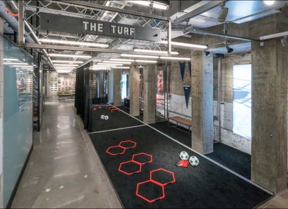 Новое пространство — пример той торговой «концепции стадиона» (метраж магазина почти такой, как футбольное поле), на которую команду бренда вдохновили спортивные стадионы средних школ. Магазин имеет вход через тоннель, стенды для просмотра игр в прямом эфире на больших экранах, стилизованные под школьные раздевалки примерочные и беговые дорожки, где клиенты могут опробовать кроссовки для бега.