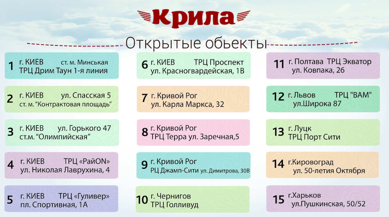 — Мариуполь, Дрогобыч, Бердянск, Никополь, Краматорск, Кривой Рог, Умань, Кировоград. В Харькове пока два ресторана, но в планах развитие еще нескольких. Информация по городам может измениться в соответствии с развитием сети.