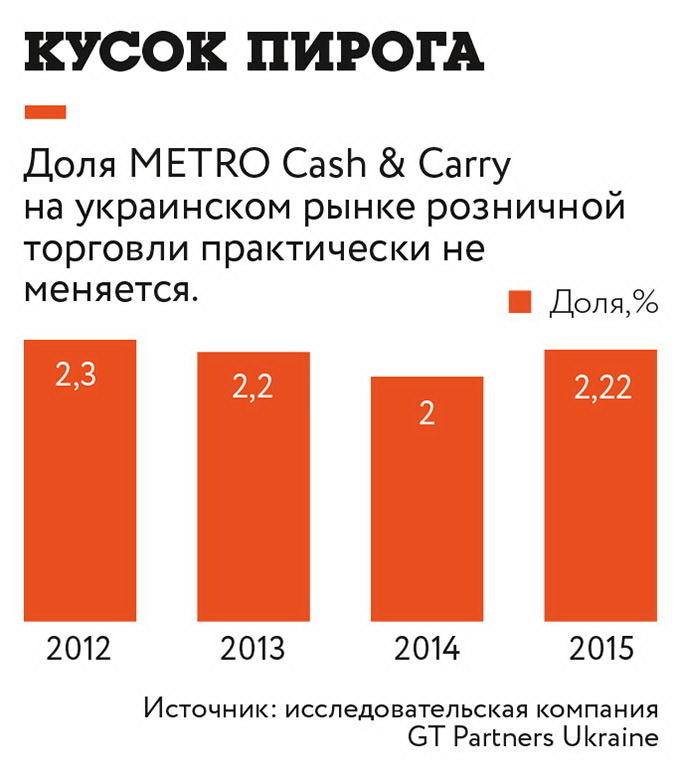 «Доля компании растет, но незначительно», — уточняет Гугля. По его данным, если в 2014 году доля METRO в общем обороте продовольственной розницы страны составляла 2%, то в 2015 году — 2,22%.