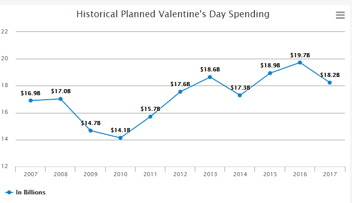 После десятилетнего увеличения расходов на День святого Валентина в этом году ожидается коррекция рынка. Об этом сказано в ежегодном опросе Национальной федерации розничной торговли и Prosper Insights & Analytics