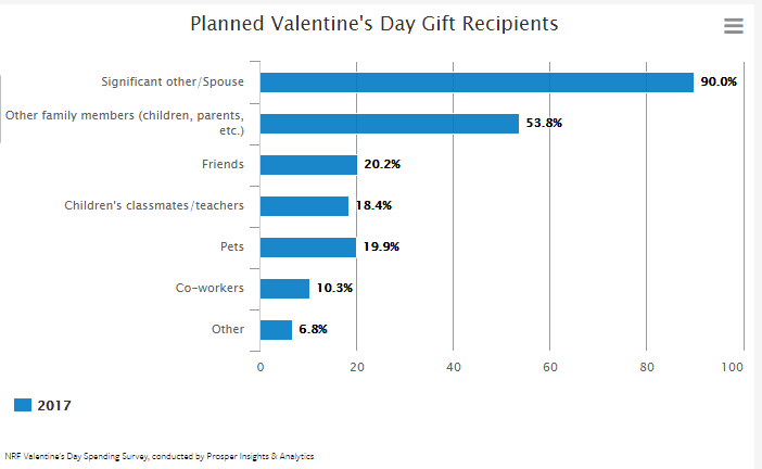 Опрос показал, что в текущем году американские потребители планируют потратить в среднем $85,21 на их вторую половинку, $26,59 — на других членов семьи — детей или родителей, $6,56 — на одноклассников детей / учителей, $6,51 — на друзей, $4,27 — на сотрудников и $4,44 — на домашних животных.
