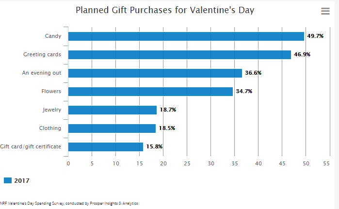 Потребители планируют потратить $4,3 млрд на ювелирные изделия (19% покупателей), $3,8 млрд на ужин (37%), $2 млрд на цветы (35%), $1,9 млрд на одежду (19%), $1,7 млрд на конфеты (50%), $1,4 млрд на подарочные карты/сертификаты (16%) и $1 млрд на поздравительные открытки (47%).