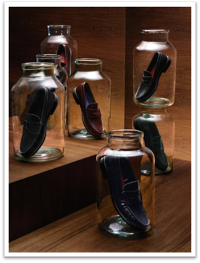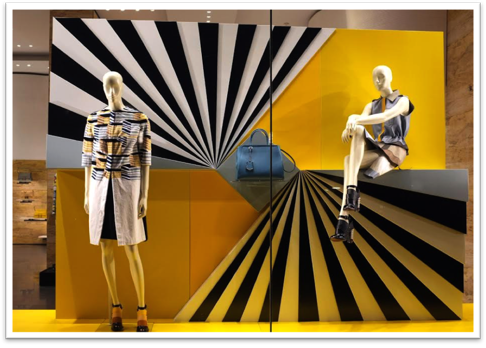 Именитые марки создают концептуальную витрину каждый сезон. Формулируется концепция Splash — манекен в несуразной позе, а вокруг него создается иллюзия движения. Получается как будто живая картина.