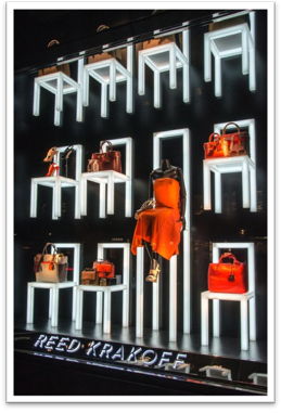 Асимметрия и симметрия в композиции на витрине привлекают внимание пешехода и делают акцент на выставленном продукте.
