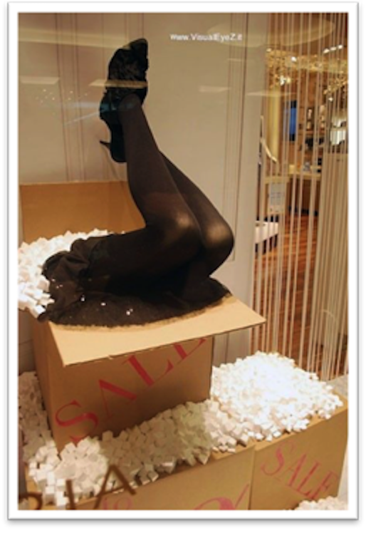 Бюджетные витрины сейчас популярны в Европе. Хотя они помогают создать интересный концепт в кризисных условиях, это не значит, что такой формат неинтересен известным мировым маркам. Для этого формата витрины используют старые вещи с барахолок и делают акцент на цветогамме, чтобы выделить детали концепта.