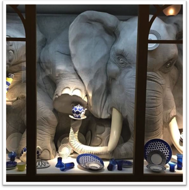Эпатажность витрины достигается за счет противоположных акцентов: глобальное и крошечное, твердое и хрупкое… Противоположный акцент — прием на запоминание товара.