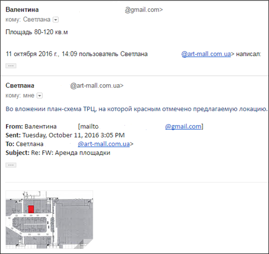 — Могу привести хороший пример ответа менеджера Art Mall: в письме была схема ТЦ с вакантной локацией.